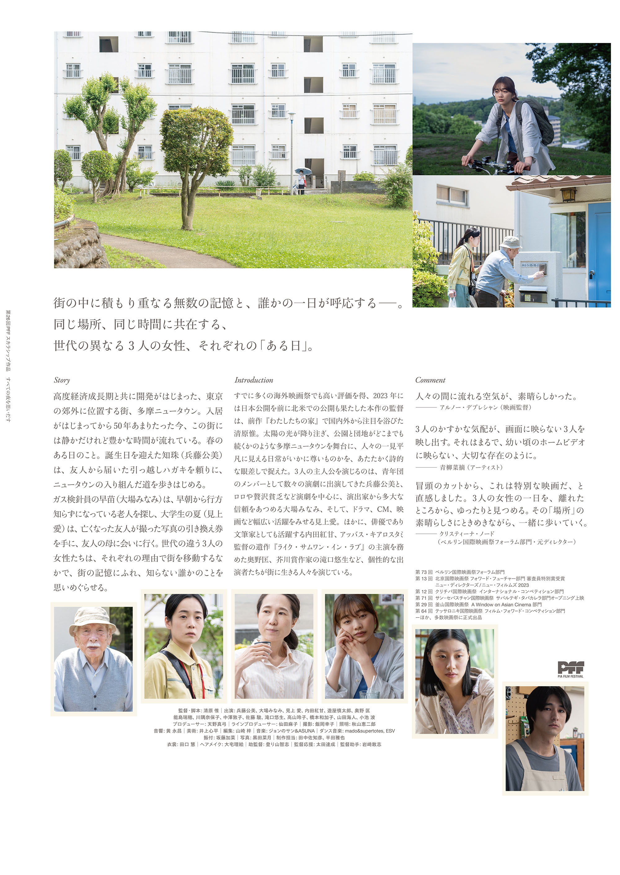 すでに多くの海外映画祭でも高い評価を得、2023年には日本公開を前に北米での公開も果たした本作の監督は、前作『わたしたちの家』で国内外から注目を浴びた清原惟。太陽の光が降り注ぎ、公園と団地がどこまでも続くかのような多摩ニュータウンを舞台に、人々の一見平凡に見える日常がいかに尊いものかを、あたたかく詩的な眼差しで捉えた。